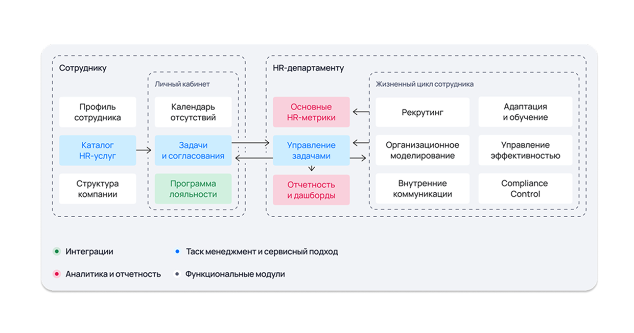 В результате была разработана интегрированная HR-платформа, где системы работают сквозным образом — от события до результата.