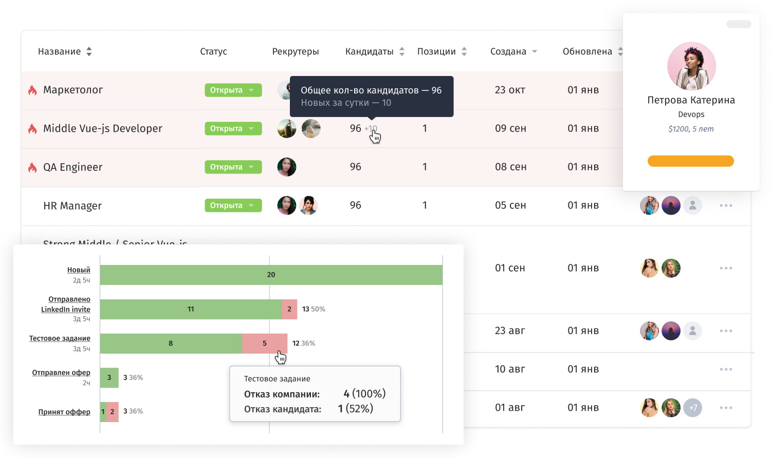 Один из самых операционно нагруженных кадровых процессов. В работе одновременно находятся десятки вакансий, сотни кандидатов, а коммуникации растянуты между отделами. Без системы легко потерять кандидата, забыть о статусе или затянуть согласование. Автоматизация рекрутинга позволяет собрать всю воронку воедино, сократить время закрытия вакансий, сделать процесс прозрачным для всех участников — от HR до бизнеса.