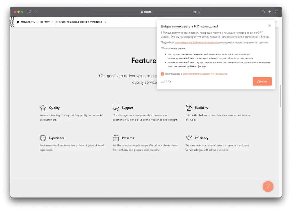 Например, Tilda внедрила ИИ-подсказки для генерации контента и анализа поведения пользователей — и уже 20 % новых проектов на платформе используют эти инструменты.