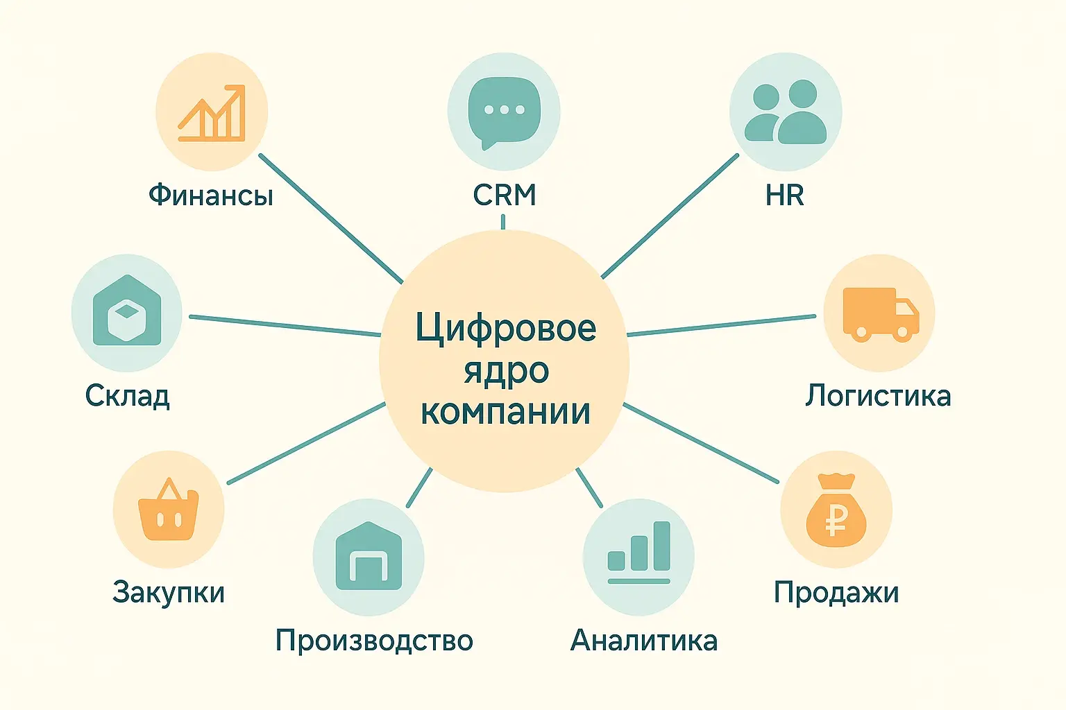 Финансы, CRM, склад, HR, производство, отраслевые модули |