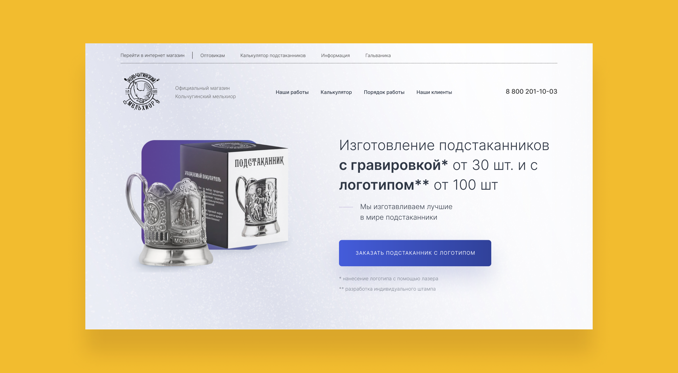 Страница «Калькулятор» помогает потенциальным клиентам просчитать стоимость будущего заказа через форму, где необходимо выбрать: тип пластины, металл, дизайн, упаковку и количество.