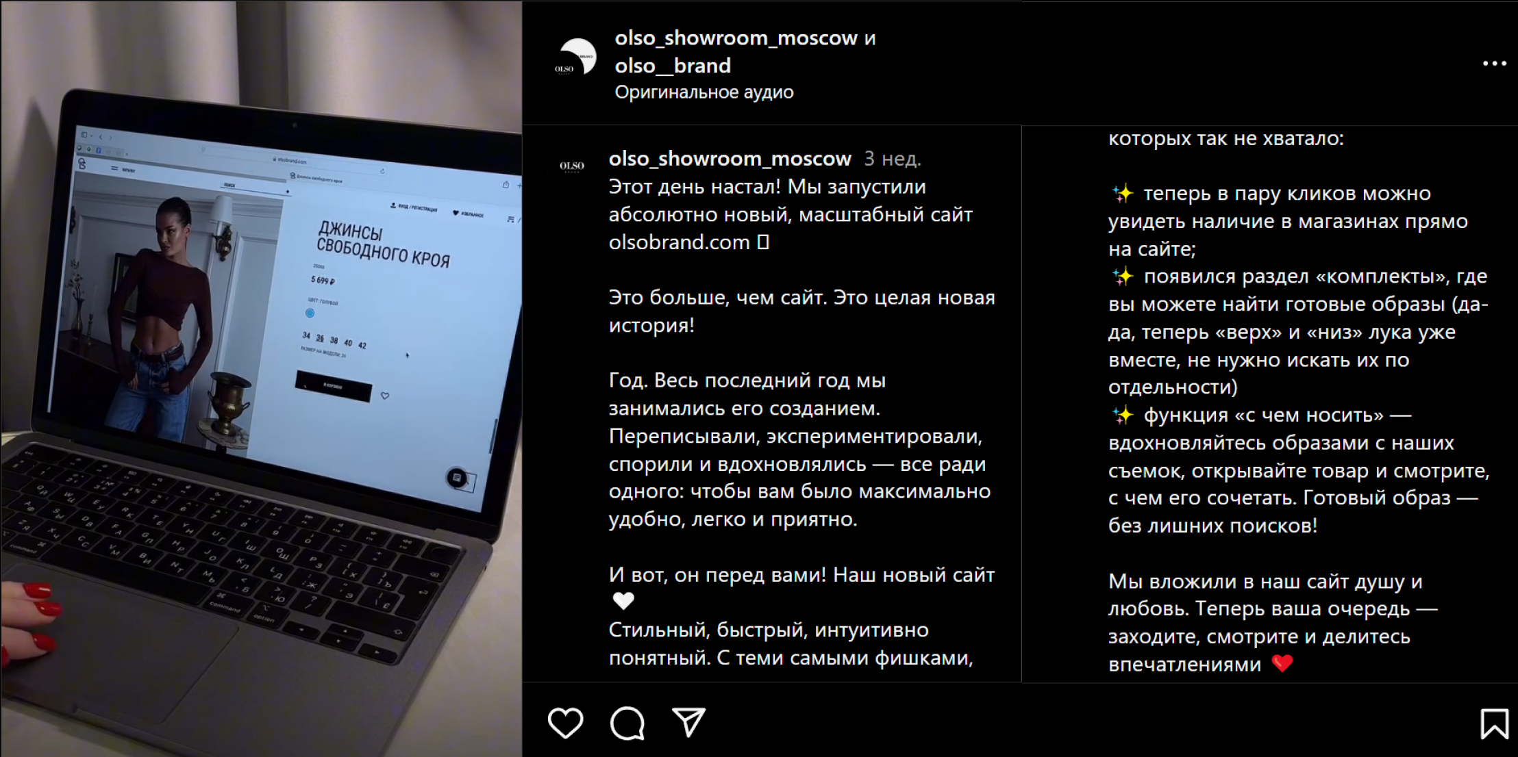 «Olso» — российский бренд женской одежды с офлайн-магазинами в Москве, Санкт-Петербурге и других крупных городах РФ. Представлен бренд и онлайн: компания активно продвигается в социальных сетях и на маркетплейсах